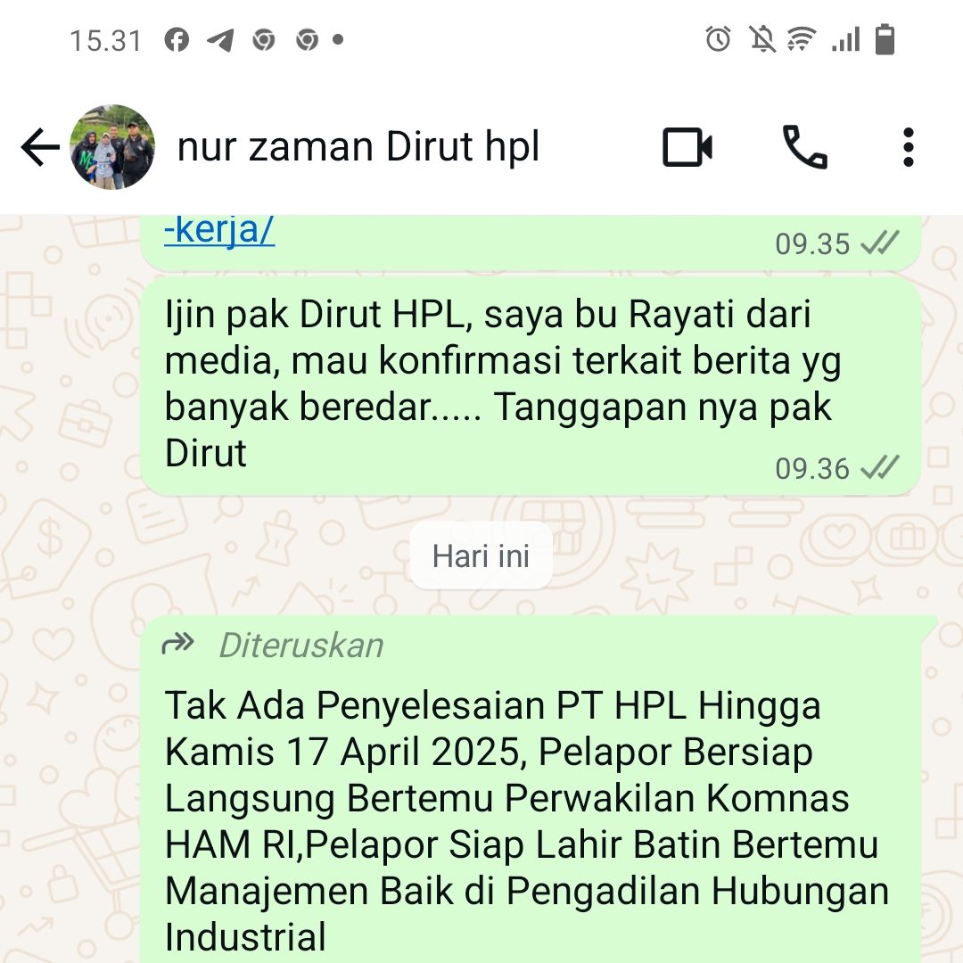 “Jika sampai hari kamis 17 April 2025,pihak manajemen belum itikad baik secara menyelesaikan sisa gaji,serta pesangon,pekerja seperti saya yang notabene saksi,dokumen surat keterangan bekerja dari Dirut PT HPL,foto-foto selama bekerja, dokumen pendukung lain, dan satu catatan selama 5,5 tahun bekerja mulai tahun 2019 silam, saya tidak pernah didaftar BPJS tenagakerja,maupun BPJS Kesehatan,”ungkap pelapor yang secara lahir batin siap bertemu dengan wakil manajemen di Pengadilan Hubungan Industrial jika mendesak ini harus sampai menempuh ke jenjang ini.